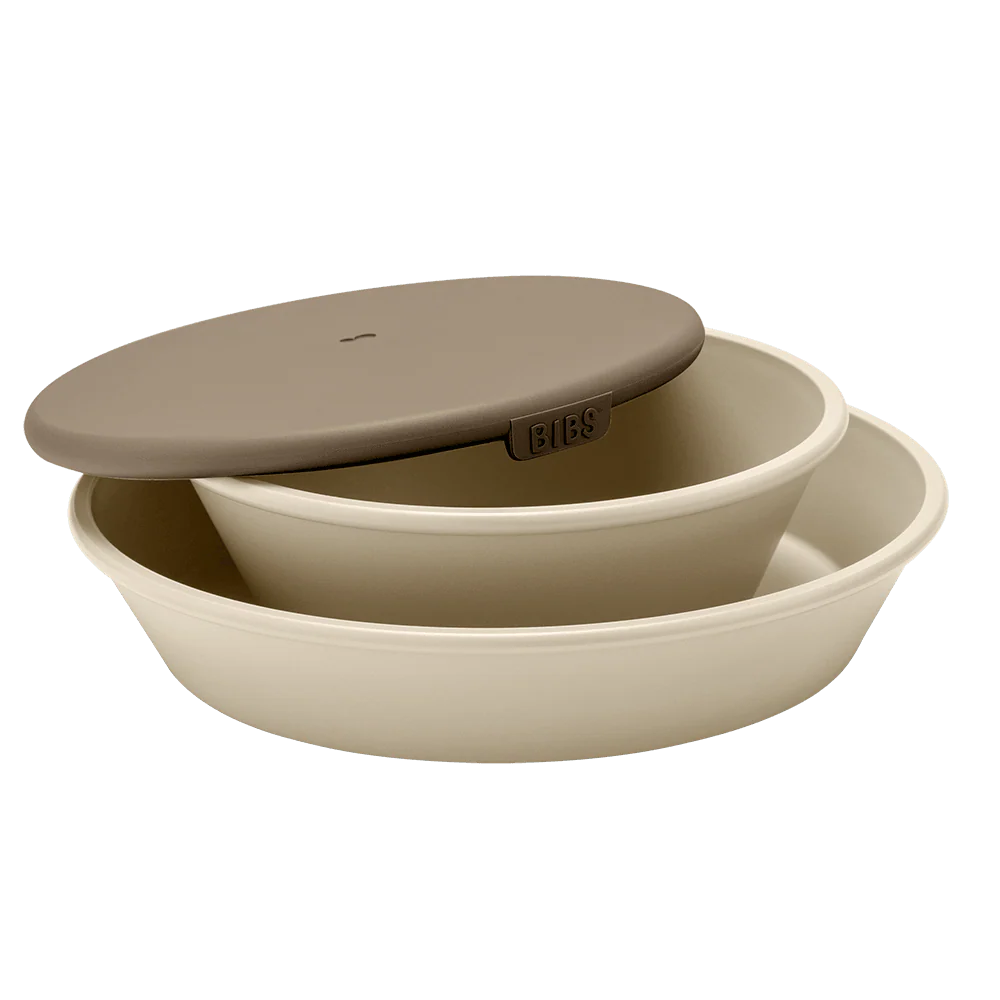 Le lot d’assiettes BIBS inclut 3 pièces. Une assiette creuse, une assiette plate et un couvercle. Le couvercle s’ajuste à l’assiette creuse pour en faire une boîte de rangement. Utilisez cette boîte pour vos trajets ou pour les restes qui doivent être réfrigérés. Le lot est disponible en des combinaisons de 4 couleurs différentes.
