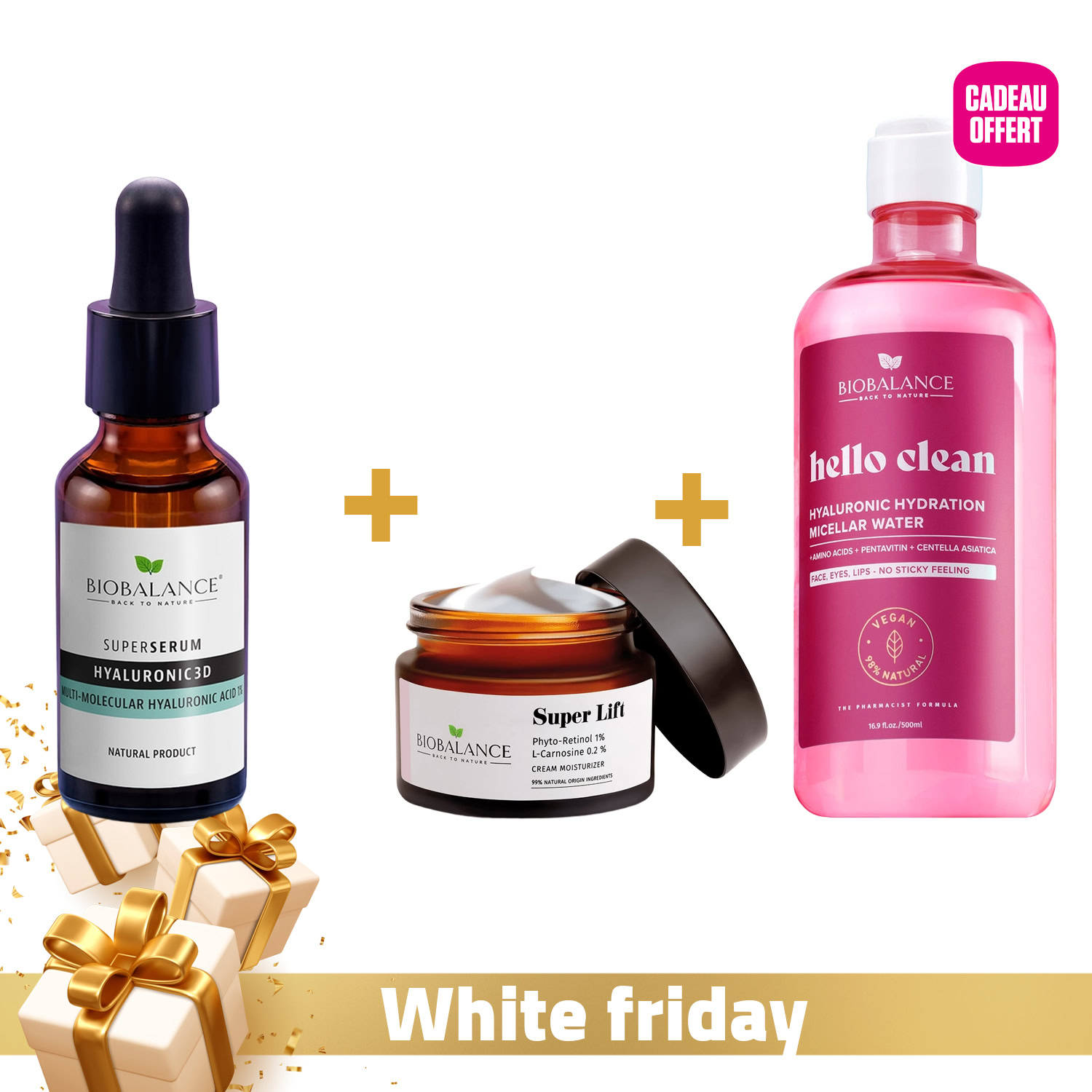 Hello Clean Eau Micellaire Hydratante Hyaluronique 500ml (offerte) : Démaquillant doux à l’acide hyaluronique et pentavitine, il élimine maquillage et impuretés tout en hydratant et apaisant la peau, tout en renforçant la barrière cutanée. Idéal pour peaux sèches, sensibles, ou sujettes à l’inconfort.