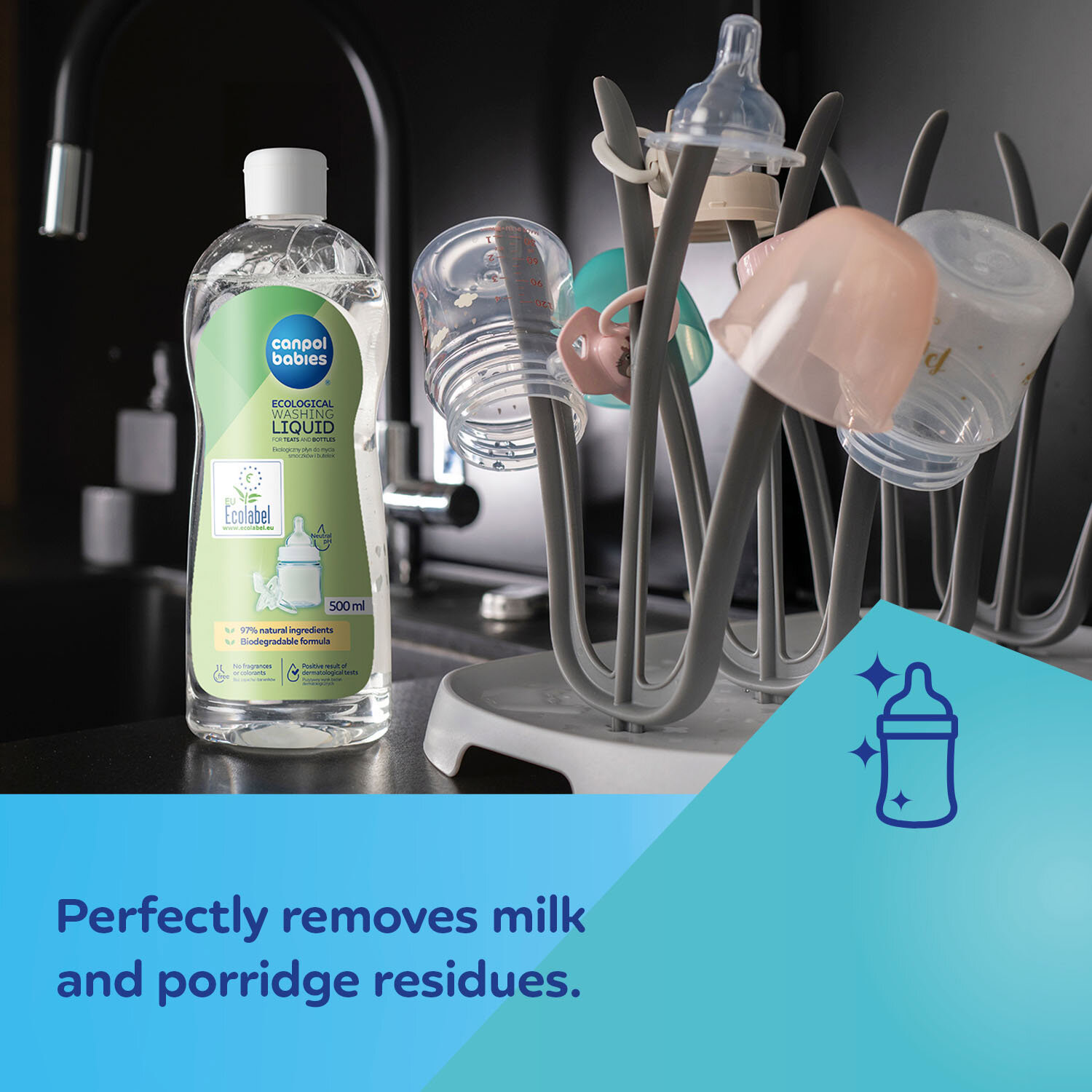 Le liquide vaisselle écologique pour tétines et biberons a été conçu dans le respect de la santé et de la sécurité de bébé. Hypoallergénique et incolore, il contient 97 % d’ingrédients d’origine naturelle. Il élimine efficacement tous les résidus de lait, de jus, de bouillies et d’aliments. Son rinçage est parfait. Sa formule douce, sans parfum ni colorant ajoutés, respecte les mains. Ce produit possède un pH neutre pour la peau et a été testé dermatologiquement. Son emballage est très pratique : une petite quantité de produit suffit pour nettoyer efficacement les accessoires de bébé tels que biberons, sucettes, tétines, assiettes, jouets et pièces de tire-lait. Le liquide vaisselle écologique Canpol Babies pour tétines et biberons est certifié par l’Écolabel européen, un label officiel européen attribué aux produits respectueux de l’environnement qui répondent à des normes élevées de qualité et de santé : PL/019/009.