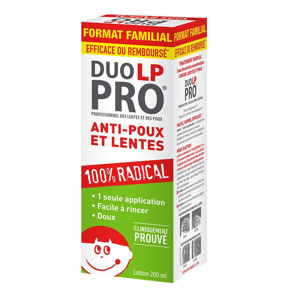 DUO LP PRO Lotion Radicale est un traitement filmogène anti lentes et anti poux. Elle étouffe le pou et facilite le décollement des lentes tout en apaisant le cuir chevelu. Invisible et incolore elle ne tache pas et elle agit en une application. Sans insecticide, sans parfum, sans rinçage elle peut être utilisée chez les enfants à partir de 6 mois.
