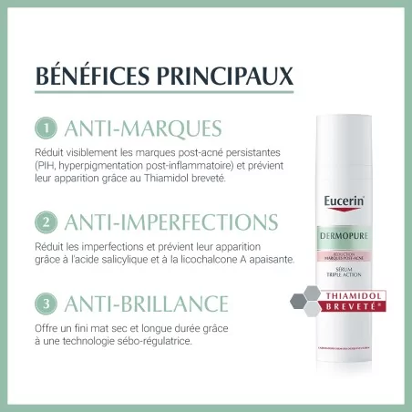 Le Sérum Triple Action DermoPure des Laboratoires dermatologiques Eucerin permet de traiter les imperfections, les marques résiduelles et de réduire les brillances grâce à sa formule à base de Thiamidol breveté visible dès 2 semaines.