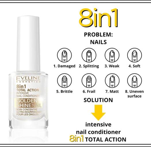 Eveline Cosmetics 8in1 Sérum Concentré Pour Ongles Total Action Conditionneur + Renforçateur + Durcisseur Avec Particules D’or | 12ml