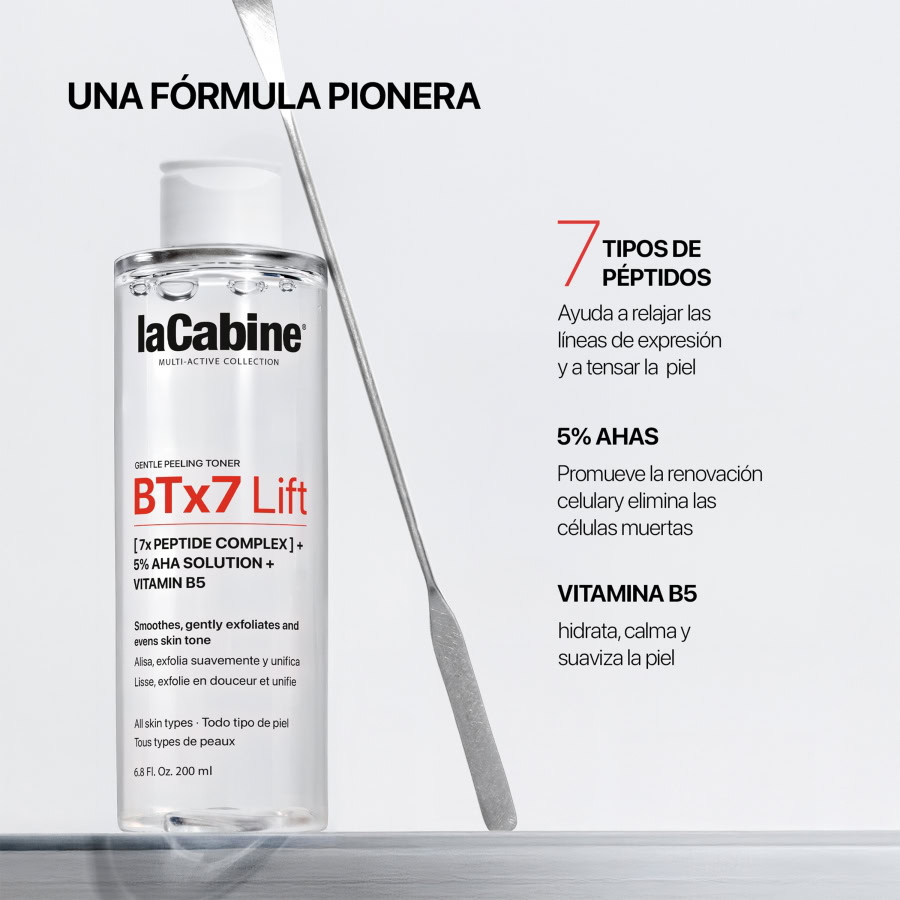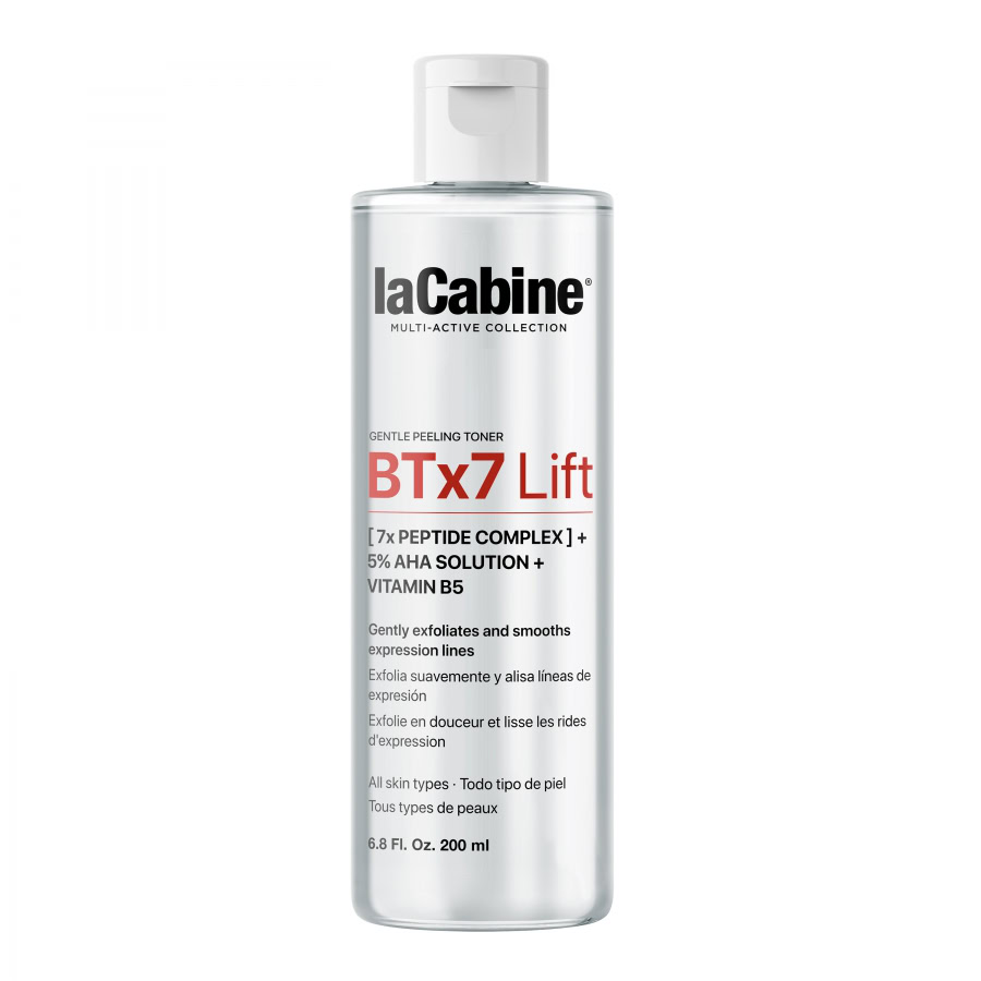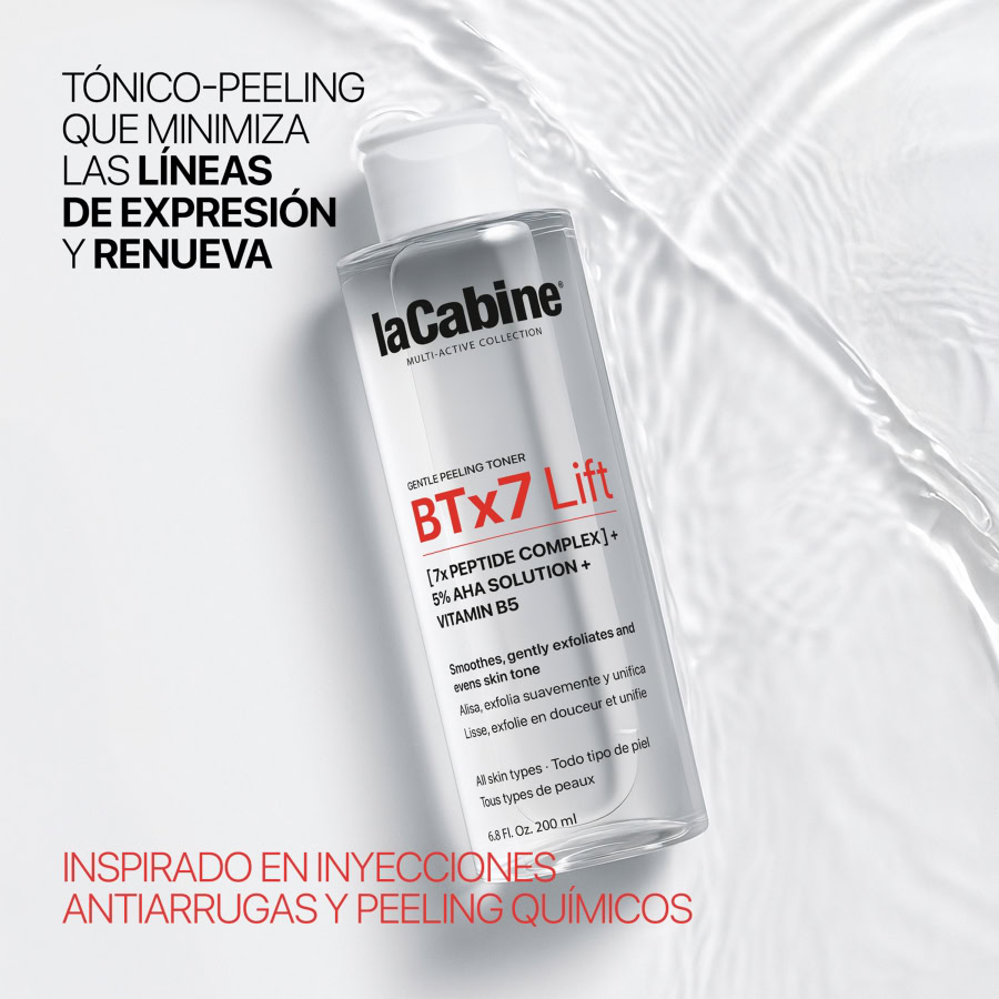Tonique Visage BTx7 Lift de laCabine, inspiré des injections anti-rides et des peelings professionnels. Il renouvelle la peau, améliore la texture et la luminosité, tout en lissant les rides.