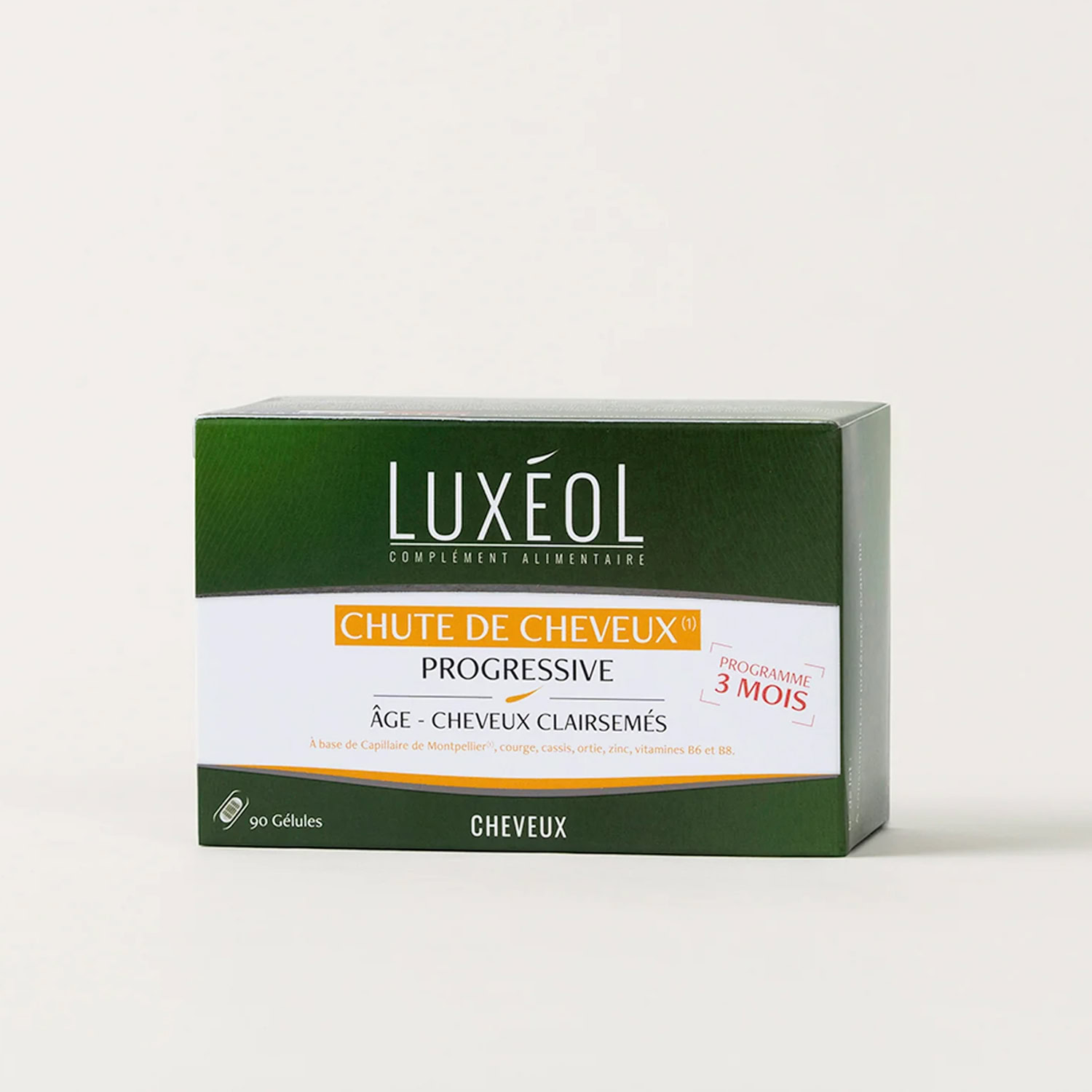 Les gélules Luxéol Chute de Cheveux Progressive vous accompagnent dans un programme de 3 mois pour vous aider à limiter la chute des cheveux et les rendre plus forts.