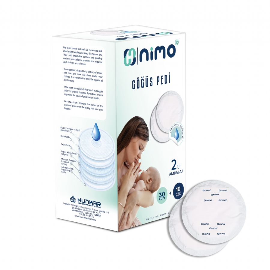 Les coussinets d’allaitement Nimo absorbent l’excès de lait après la tétée et gardent les mamelons au sec. Leur surface douce et respirante et leur rembourrage en cellulose pure préviennent les irritations cutanées et les taches sur les vêtements.