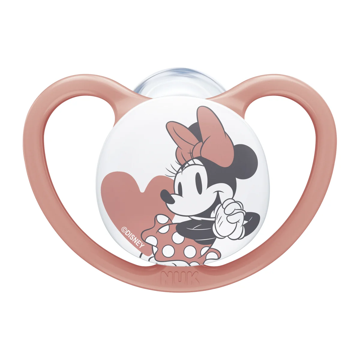 Sucette NUK Minnie 6-18M en silicone : bouclier ventilé qui protège la peau, tétine physiologique respectueuse du développement, stérilisation rapide en boîte micro-ondes.