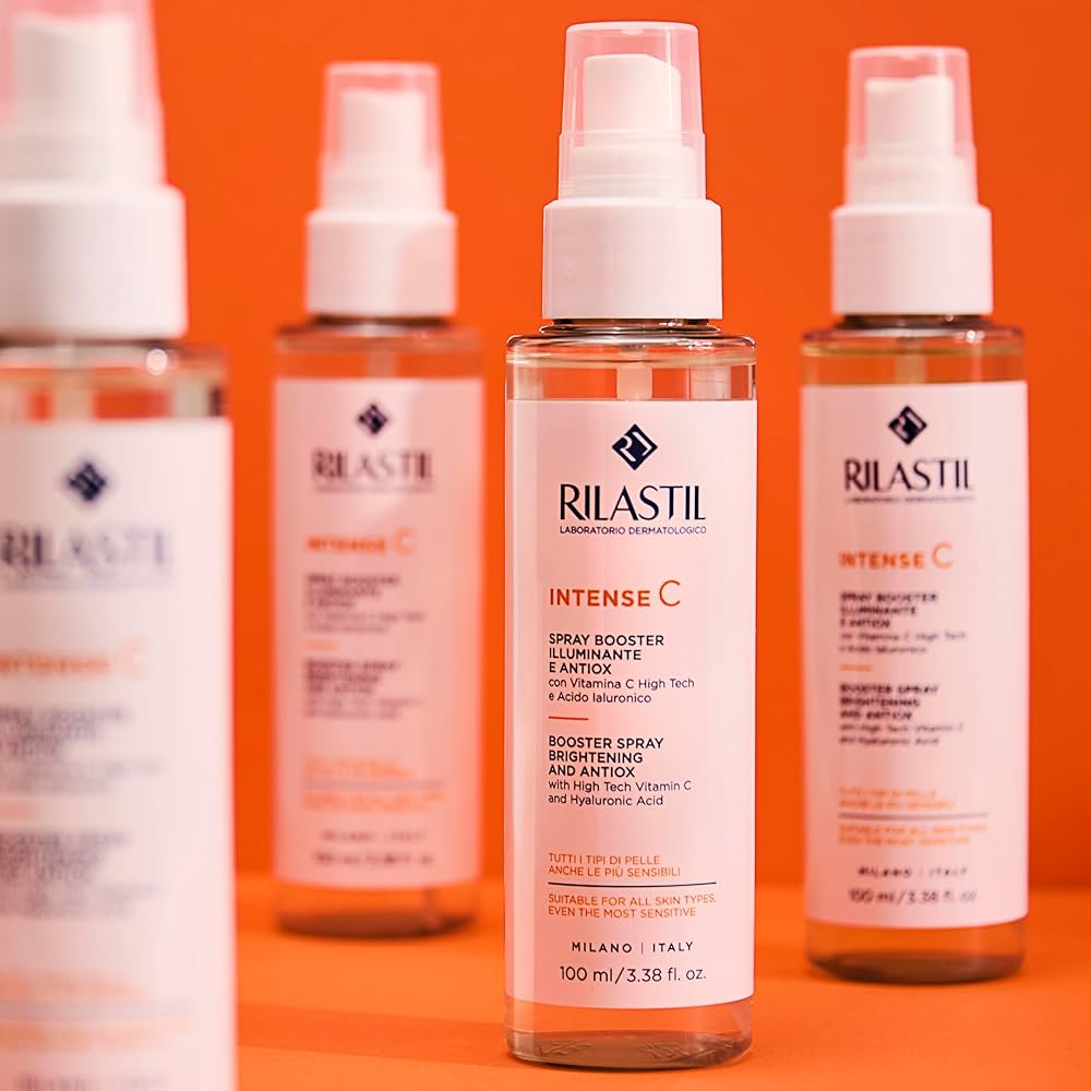 Rilastil Intense C Spray Illuminateur Booster et Antiox à la Vitamine C High Tech et à l’Acide Hyaluronique illumine et lisse la peau du visage, du cou et du décolleté.