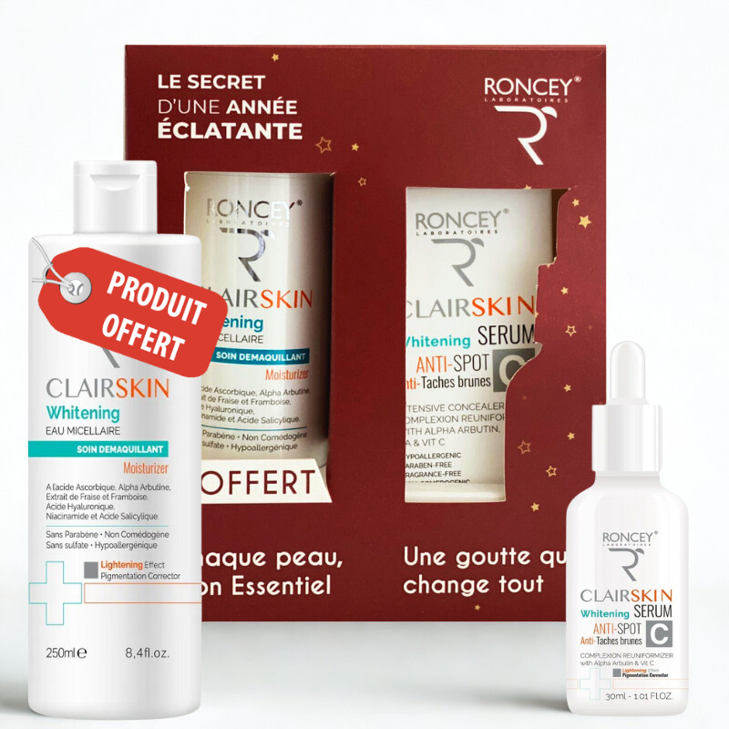 Clairskin Eau Micellaire Éclaircissante 250ml (offerte) : Eau micellaire nettoyante, démaquillante et éclaircissante, enrichie en vitamine C (acide ascorbique), alpha‑arbutine et acide hyaluronique. Elle élimine maquillage et impuretés, traite les taches, aide à éclaircir et unifier le teint tout en hydratant et respectant les peaux sujettes aux troubles de la pigmentation, à utiliser matin et soir sur visage et yeux.
