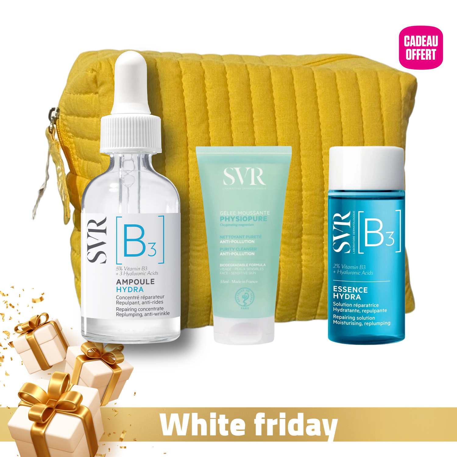 SVR [B3] Essence Hydra Solution Réparatrice 30ml (offert) : Essence concentrée en 2 % de vitamine B3 et deux acides hyaluroniques, qui apaise, défroisse et hydrate 24h, prépare la peau à recevoir les soins et renforce jour après jour la barrière cutanée. La peau est plus souple, repulpée et les ridules de déshydratation sont atténuées.