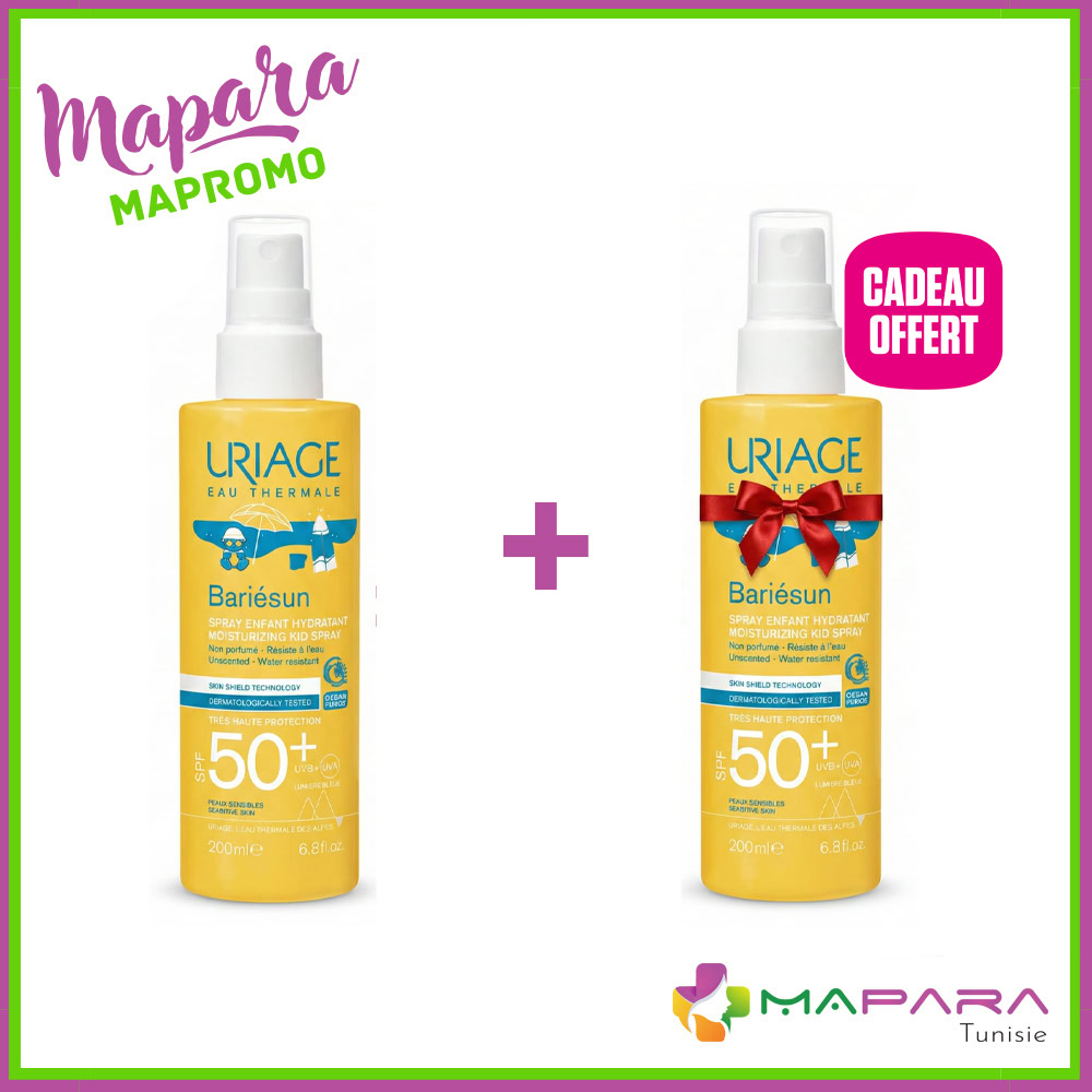 Ce pack contient 2 sprays solaires enfants Uriage Bariésun SPF 50+ 200 ml, le deuxième flacon étant offert (offre 1+1).