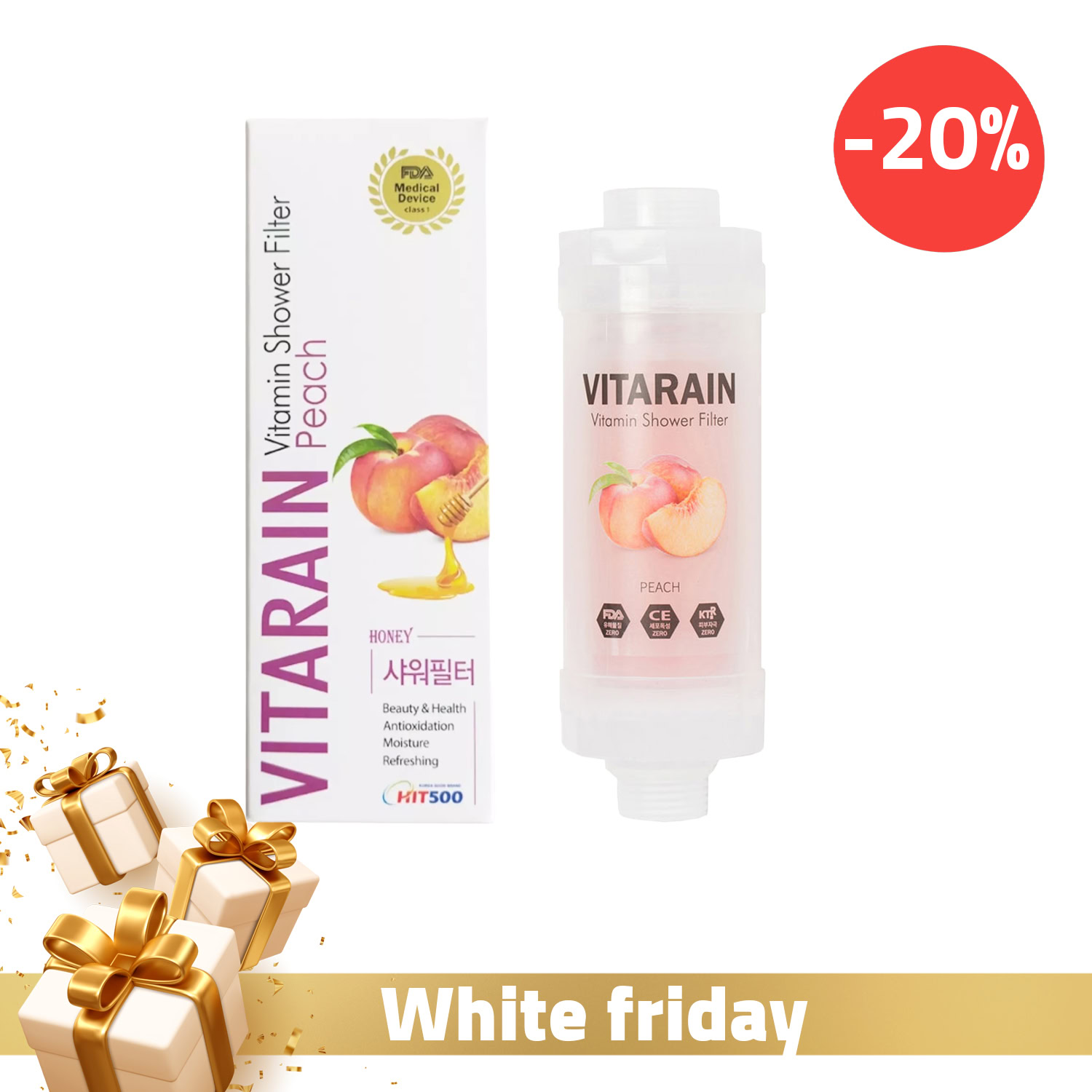 VITARAIN Le filtre de douche Vitarain à la pêche permet d’éliminer le chlore et les métaux lourds présents dans l’eau du robinet en y laissant un subtil parfum. Il réduit l’agression des cheveux et de la peau causés par une eau trop dure pour une douche purifiée, un corps & des cheveux sublimés!