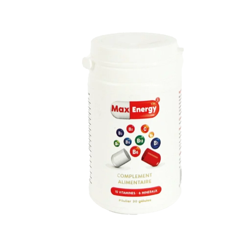 Young Health Max Energy est un complément alimentaire à base de vitamines C, B1, B2, B5, B6, et de 6 minéraux essentiels. Il est formulé pour soutenir votre énergie et votre bien-être, en revitalisant votre corps et en améliorant le métabolisme énergétique. Ce produit est entièrement naturel, sans conservateurs, vous offrant une solution saine et efficace pour combattre la fatigue et maintenir votre forme.